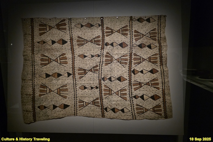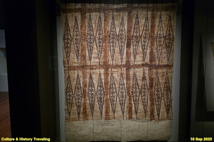 나무껍질을 두드려 만든 직물로 여성이 만듭니다. 직물이 귀한 폴리네시아에서 상류층 남성과 여성만이 사용할 수 있었습니다. 또한 보호막 역할을 한다고 여겨 신성한 공간이나 보호해야 할 물건을 감쌌습니다. 피지에는 신생아, 신혼부부, 지도자 그리고 죽은 이의 몸을 타파로 감싸는 의식이 전합니다. (안내문, 중앙박물관 특별전, 2025년)