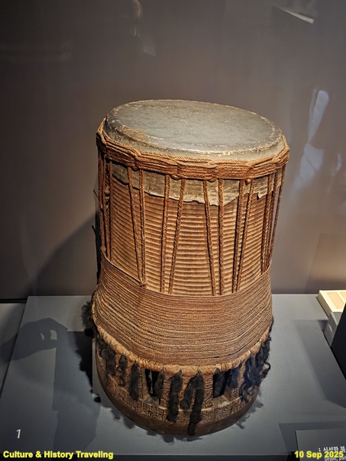 북은 나팔과 함께 마르키즈 제도에서 가장 사랑받는 악기입니다. 잔치나 의식이 있을 때면 다양한 크기의 북을 연주하며 노래를 부르고 춤을 췄습니다. 북의 아래쪽에는 이승과 저승을 오가는 존재로 여겼던 거북과 도마뱀을 새겼습니다. 북에 장식한 머리카락은 단순한 악기가 아닌 신성한 도구임을 보여줍니다. (안내문, 중앙박물관 특별전, 2025년)