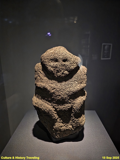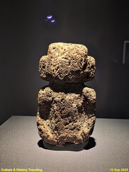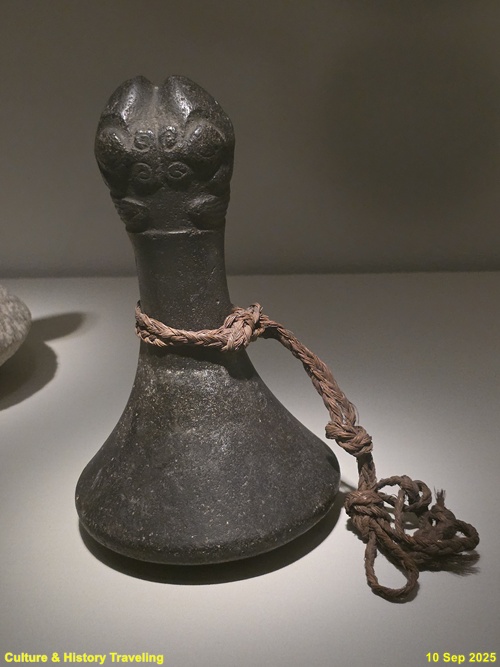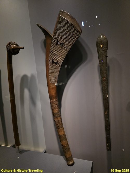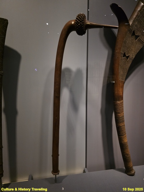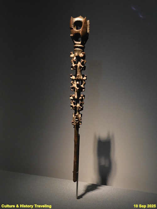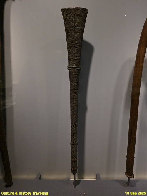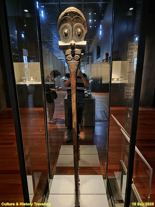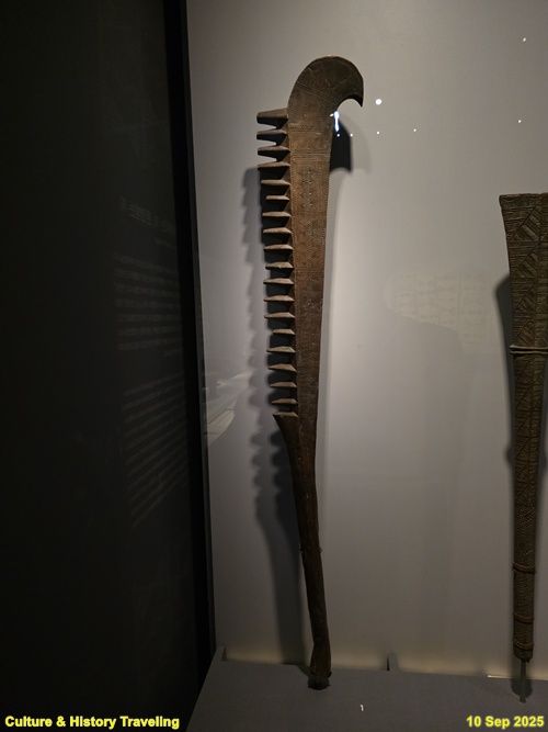 적에게 마지막 일격을 가하는 무기로 권위를 상징합니다. 군사의 행렬이나 의식에서 족장의 권위를 과시할 때도 사용했습니다. 위에는 신성한 조상’티키(Tiki)’의 머리를 새겼습니다. 머리는 영적인 힘인 마나(mana)가 머무는 공간으로 많으면 많을수록 힘이 더 세집니다. 커다란 두 눈은 ‘모든 것을 꿰뚫어 보는 시선’을 나타냅니다. (안내문, 중앙박물관 특별전, 2025년)