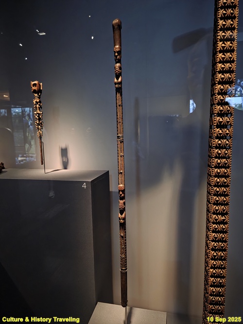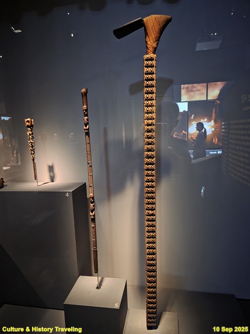 ‘마라에(marae)’라고 불리는 의식 장소에서 발언할 수 있는 사람이 사용했던 지팡이입니다. 형태와 장식은 주인의 혈통, 즉 화카파파(whakapapa)를 나타냅니다. 지팡이의 윗부분과 가운데에 새겨진 두 사람의 모습은 지팡이 주인의 조상이나 그가 속한 공동체의 조상을 뜻합니다. (안내문, 중앙박물관 특별전, 2025년)