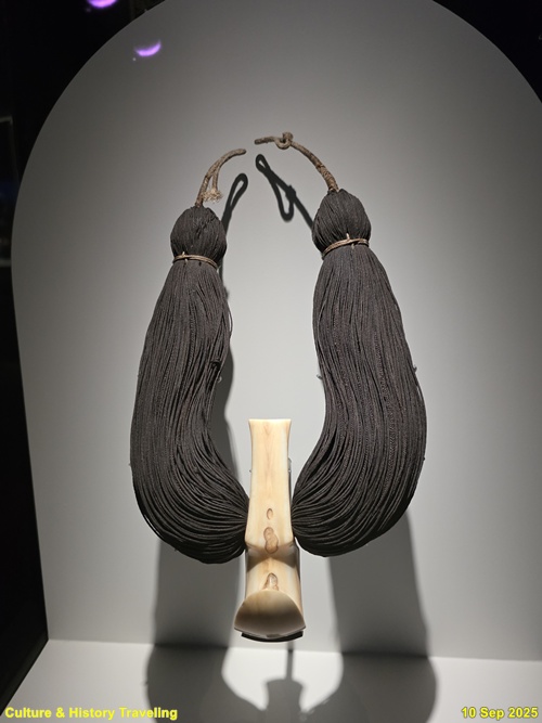 옛 하와이 사회에서 귀족 남성과 여성이 착용하던 목걸이입니다. 정성스럽게 땋아 만든 머리카락과 바다코끼리 이빨은 신성한 의미를 지닌 귀한 재료입니다. 폴리네시아 문화에서는 머리뿐 아니라 머리카락에도 역시 신성한 힘인 마나가 담겨 있어 타인의 머리카락으로 만든 장신구를 착용하면 그의 힘을 더할 수 있다고 여겼습니다. (안내문, 중앙박물관 특별전, 2025년)