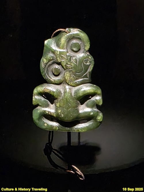 ‘헤이(hei)’는 ‘목에 걸다’란 의미를, ‘티키(tiki)’는 최초의 인간이자 신성한 존재를 의미합니다. 이것을 착용한 사람은 권위와 명예의 마나(mana)를 지니며 생명력과 조상에 대한 기억인 ‘마우리(mauri)’를 품게 된다고 믿었습니다. 높은 계층의 남녀가 착용하며 귀중한 가보로 여겨 후손 대대로 물려주었습니다. (안내문, 중앙박물관 특별전, 2025년)
