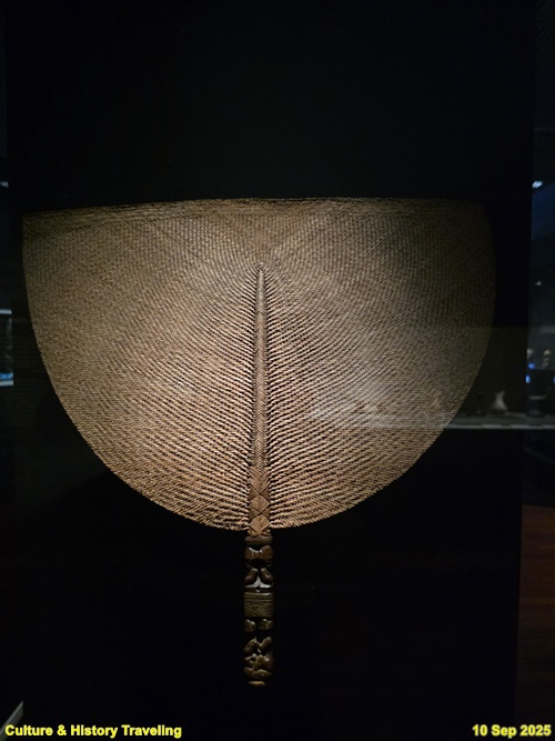 넓고 납작한 직조물 부채로 손잡이에는 한 쌍의 티키(tiki)를 새겼습니다. 티키는 폴리네시아에서 최초의 인간이자 조상으로 여기는 신성한 존재이며 혈통과 마나(mana), 보호를 상징합니다. 부채는 일상용품이자 신성한 의미와 권위를 지닌 물건으로 전문 장인이 만들었으며 직조는 여성이, 조각은 남성이 담당했습니다. (안내문, 중앙박물관 특별전, 2025년)