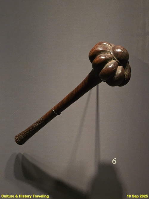근접 전투에서 마지막 일격을 가하는 무기로, 형태는 판다누스 열매에서 영감을 얻었습니다. 상감 장식이나 정교한 조각 등 뛰어난 완성도로 볼 때 피지 상류층이 사용했던 것으로 보입니다. 프랑스 장교이자 탐험가 뒤몽 뒤르빌이 수집한 것으로, 그는 오세아니아를 탐험하고 처음으로 멜리네시아, 폴리네시아, 미크로네시아로 구분했습니다. (안내문, 중앙박물관 특별전, 2025년)