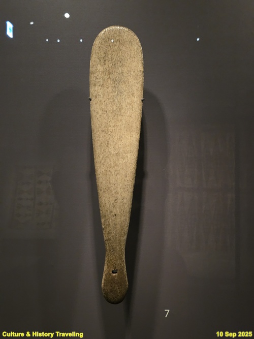 짧은 손잡이에 주걱 모양의 날이 달려있는 근접 전투용 무기입니다. 마나(mana), 명망, 권력을 상징하는 물건이기도 해서 전투를 하지 않을 때는 허리에 차고 다니며 지위를 나타냈습니다. 의식 공간인 마라에(marae)에서는 지도자들이 연설을 시작하거나 마무리할 때 이것을 들어 연설에 권위를 더했습니다. (안내문, 중앙박물관 특별전, 2025년)