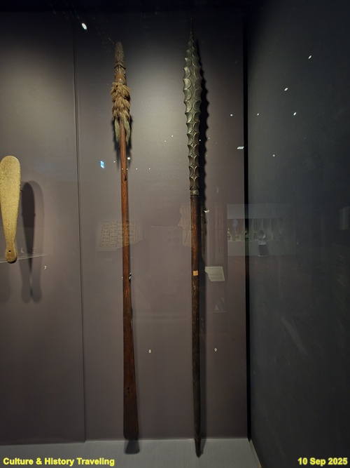 근거리 전투용 무기이자 권위를 상징하는 물건으로 결투 의식인 ‘웨로(wero)’에서도 사용합니다. 끝에는 두 개의 이마에 혀를 내밀고 있는 머리 장식을 새겼습니다. 내민 혀는 생명력(mauri)을 상징하며, 동시에 죽음을 두려워하지 않는 결연한 태도를 표현합니다. 마오리 문화에서 전사의 정신과 지도자의 권위를 상징하는 물건입니다. (안내문, 중앙박물관 특별전, 2025년)