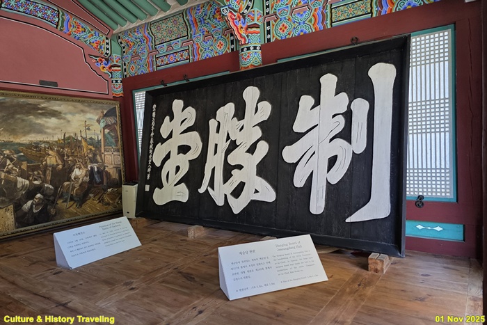 제승당에 걸려있는 현판의 ‘제승당’은 제107대 통제사 조경의 친필이고 안에 보관된 대형 현판은 제140대 통제사 김영수의 친필이다.