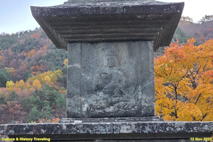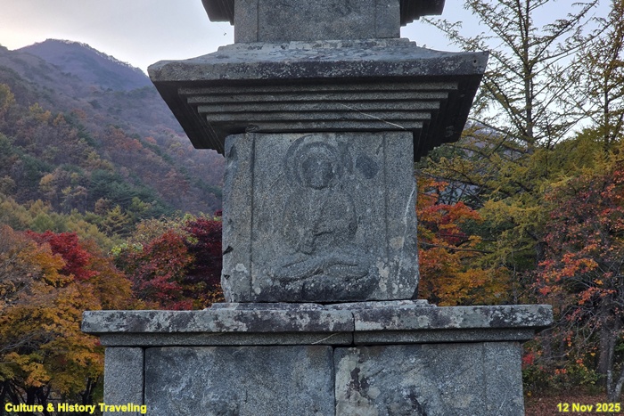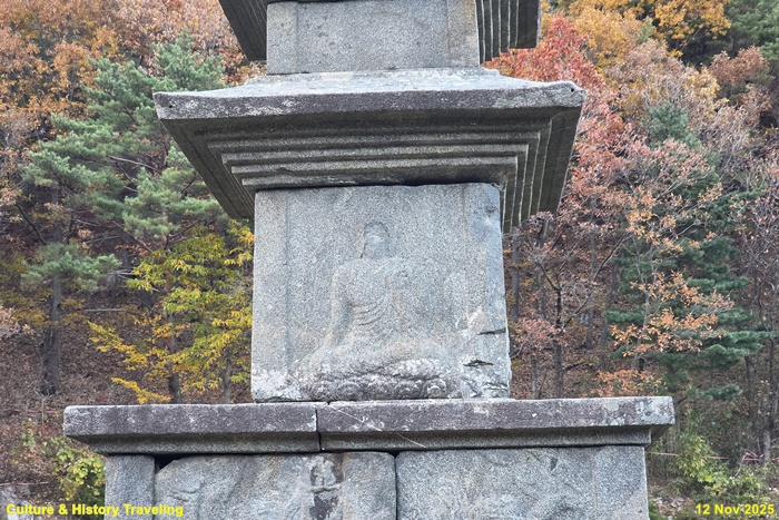 1층 몸돌 동서남북 네 면에 각각 여래좌상이 조각되어 있어, 사방에서 부처님이 탑을 지키는 형상을 하고 있다. 지붕돌의 처마 네 귀퉁이가 살짝 치켜올라가 있어, 육중한 돌탑임에도 날렵하고 경쾌한 느낌을 준다. 탑의 꼳개 장식은 현재 받침돌만 남아 있다.