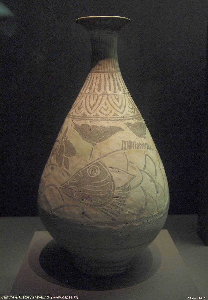 연꽃 물고기무늬 병(粉靑沙器剝地蓮魚文甁, 조선 15~16세기),