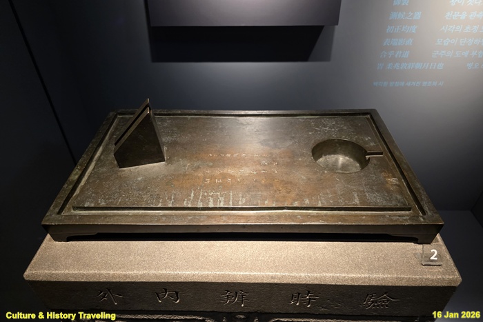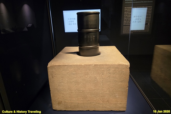 “빗물의 양을 측정하는 전통은 세종 24년(1442) 제작한 높이 1척 5촌, 지름 7촌의 구리 측우기로 거슬러 올라갑니다. 서운관과 각도의 군·현에서는 비가 올 때마다 빗물의 양을 측정하고 보고했습니다. 영조 46년(1770) 옛 제도에 따라 측우기를 만들어 창덕궁, 경희궁 두 궁궐과 팔도, 양부(강화·개성)에 설치했습니다. 그 그릇은 비록 작으나 두 성군께서 홍수와 가뭄을 다스리고자 힘쓴 뜻이 담겨 있으니 어찌 소중치 아니합니까 …. 이 측우기는 임금과 백성의 걱정과 기쁨이 연결되어 있으니 신들이 감히 공경히 지키고 부지런히 살피지 않겠습니까 ” (안내문, 고궁박물관, 2025년)
