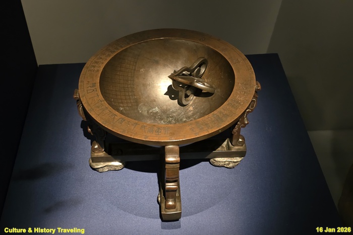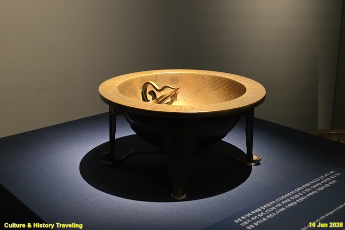 청동으로 만들고 은으로 글씨를 새겨 넣은 앙부일구다. 시각 눈금은 1654년(효종 5) 이후 사용한 12시 96각 체계를 적용하고 있다. 한양 북극고도가 37도 20분이라고 새겨져 있는데, 1713년(숙종 39) 실측한 값인 37도 39분 15초와 차이가 있어, 1713년 이전에 제작된 것으로 보인다. (안내문, 고궁박물관, 2025년)