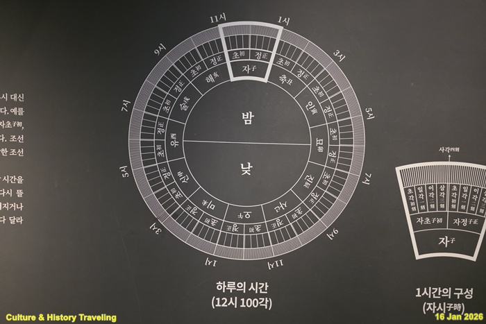 조선시대에는 현재와는 다른 시간 체계를 썼습니다. 하루를 24시 대신 12시로 나누고, 매시를 다시 둘로 나눠 초初와 정正이라고 하였습니다. 예를 들어, 밤 11시에서 1시는 자시子時에 해당하는데, 자시는 다시 자초(子初), 자정(子正)으로 나뉩니다. 시보다 더 작은 시간 단위는 각刻입니다. 조선전기에는 12시를 100각으로 나누었고, 시헌력을 적용하기 시작한 조선 후기에는 96각으로 나누었습니다. 낮과 밤 시간을 균일하게 파악하는 현재와 달리 조선시대에는 밤 시간을 파악하는 데 별도의 체계를 사용했습니다. 해가 질 때부터 다시 뜰 때까지의 밤 시간은 5경 5점으로 나누었는데, 계절마다 길어지거나 짧아지는 실제 밤의 길이를 반영해 경과 점의 길이가 절기마다 달라 졌습니다. (안내문, 고궁박물관, 2025년)