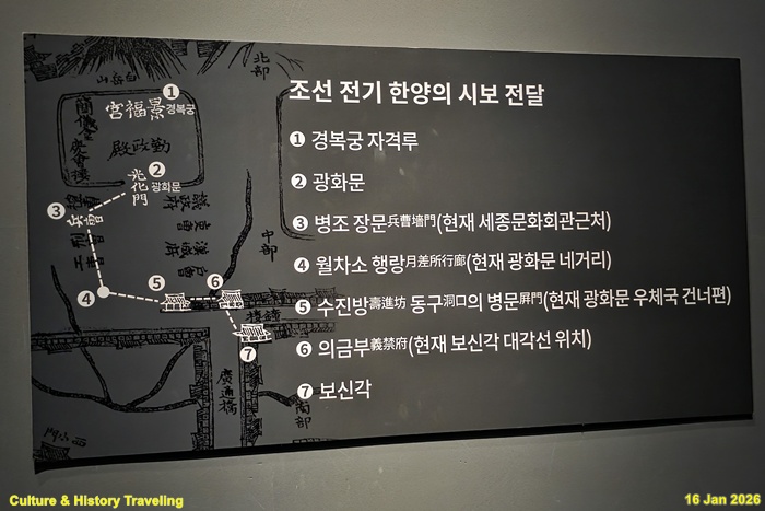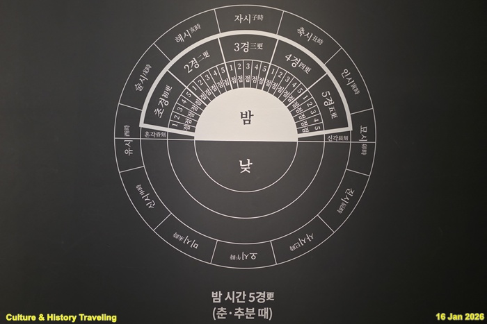 경복궁 자격루에서 종, 북, 징을 쳐 시간을 알리면 광화문, 의금부 및 한양 곳곳에 설치된 전루소(傅漏所)를 통해 신호를 전달했고, 보신각 종루에서 도성 전체에 시간을 알렸습니다. 조선시대 가장 중요한 시간 알림은 백성들의 통행과 관련된 인정(人定)과 파루(罷漏)였습니다. 인정은 초경 삼 점에 종을 28번 쳐 도성 문을 닫으며 밤의 시작을 알렸고, 파루는 오경 삼 점에 종을 33번 쳐 밤의 끝을 알리며 도성 문을 열었습니다. (안내문, 고궁박물관, 2026년)