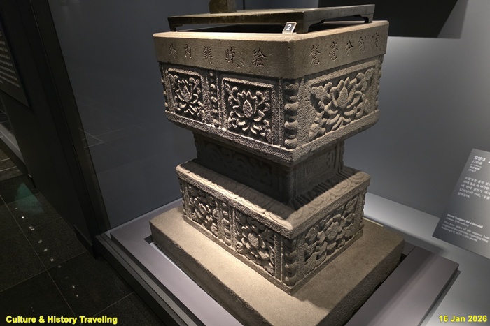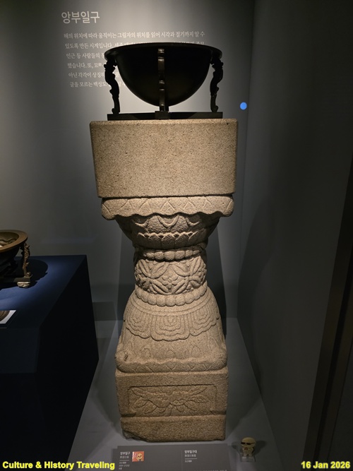 앙부일구를 올려놓았던 받침대이다. 상단 네 면에 홈을 파 앙부일구를 고정할 수 있게 하였다. 몸체에는 연잎, 구슬, 불수감 등 다양한 무늬를 새겨 넣어 장식했다. (안내문, 고궁박물관, 2029년)