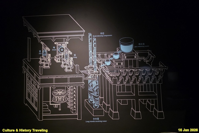 그릇에 일정한 속도로 흘러든 물의 양으로 시간을 측정하는 시계입니다. 조선시대에 만들어진 대표적인 물시계로는 자격루가 있습니다. 1434년에 세종의 명으로 장영실이 만들어 경복궁 경회루 남쪽 보루각에 처음 설치 했습니다. ‘스스로 치는 시계’라는 뜻의 자격루는 물을 받는 항아리인 수수호의 물이 일정량에 도달하면 자동으로 종, 북, 징을 쳐 시각을 알려주게 만들었습니다. 해시계나 별시계와 달리 밤과 낮, 맑은 날과 흐린 날에 관계없이 사용할 수 있어서 표준 시계로 쓰였습니다. 일정한 시간마다 자격루에서 울리는 북과 종소리는 광화문을 거쳐 궁궐 밖 종루에 전달되어 도성 전체에 시간을 알렸습니다. (안내문, 고궁박물관, 2026년)
