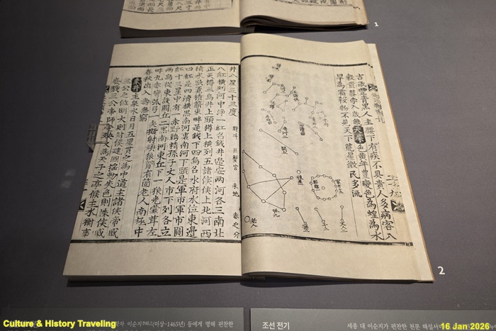 조선은 건국 초부터 천문학 정비를 위해 힘을 쏟았습니다. 조선을 세운 태조는 돌에 새긴 천문도인 <천상열차분야지도각석(天象列次分野之圖刻石)>을 만들어 조선의 건국이 하늘의 뜻에 의한 것이었음을 드러내고자 했습니다. 또한 서운관(書雲觀, 후에 觀象監)을 설치해 천문 현상을 관측하고 역법 및 시간 측정을 담당하는 기관으로 삼았습니다. 정치, 경제, 사회, 문화 등 각 분야에서 나라를 다스리는 기반이 다져진 세종대에는 천문학에서도 눈에 띄는 성취가 이루어졌습니다. 다양한 천문 의기(天文儀器)가 제작되었고 천문 연구를 바탕으로 여러 서적을 간행했습니다. 당시 통용되던 중국과 이슬람의 역법을 한양을 기준으로 수정해 조선에서 적용할 수 있는 역법의 기초를 만들었습니다. 조선 후기에는 일본, 중국과의 전쟁 후 나라를 재건하는 과정에서 천문학 정비에 많은 힘을 기울였습니다. 전란으로 소실된 천문 의기들을 다시 만들고, 서양의 천문학과 시헌력(時憲暦)을 수용하면서 천문학 지식은 더욱 심화되었습니다. (안내문, 고궁박물관, 2026년)