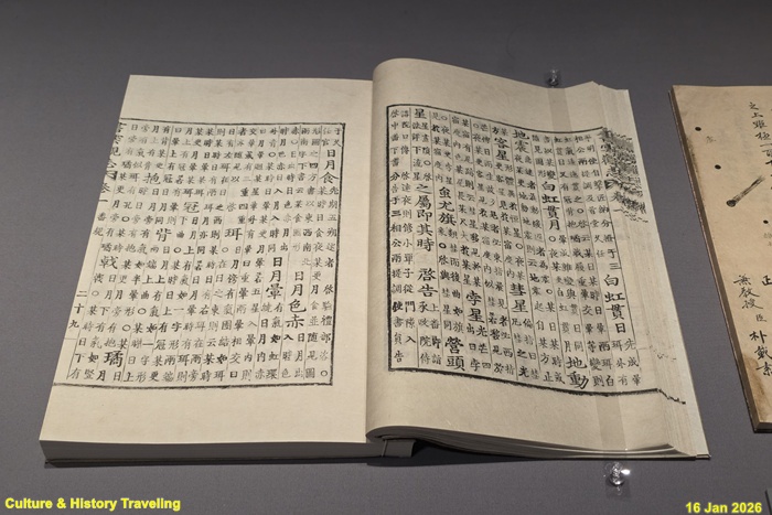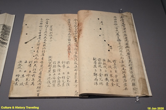 1759년에 나타난 핼리혜성 관측 기록이다. 기록은 25일간 이어지며 관측 시각과 위치, 혜성 꼬리의 크기, 움직임의 변화 등을 기록하고 모양을 그려 놓았다. 핼리혜성은 약76년 주기로 지구에 다가온다. 가장 최근 관측된 것은 1986년 2월이며 2061년에 다시 나타날 예정이다. (안내문, 고궁박물관, 2026년)