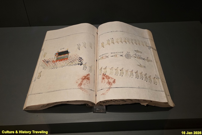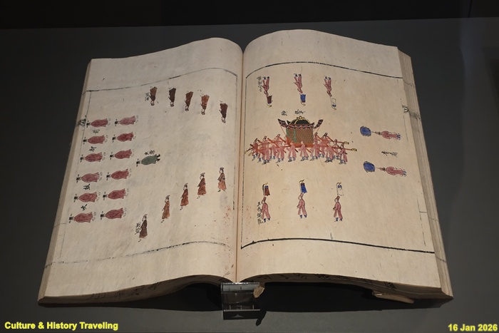 1878년(고종 15) 5월 철종비 철인왕후哲仁조(1837~1878년)가 세상을 떠나자 국장도감, 산릉도감, 빈전혼전도감이 설치되어 국상 업무를 맡아보았다. 국장도감의궤는 철인왕후의 관을 능에 모시는 장례를 관장했던 국장도감의 업무를 기록한 책이다. 1878년 9월 16일에 이루어진 발인 행렬의 반차도와 더불어 대여(大轝), 견여(肩輿), 의장(催仗), 책보(册賣), 부장품 등의 도설 및 제작 관련 사항, 의례 절차 등이 수록되어 있다. (안내문, 고궁박물관, 2026년)
