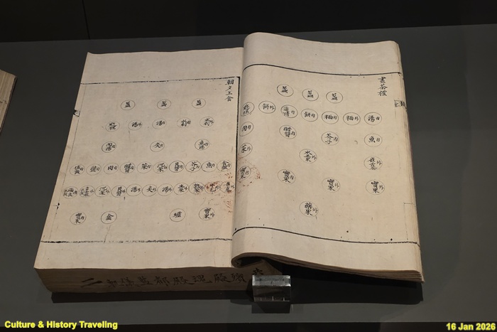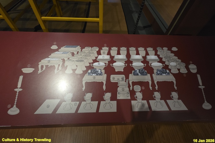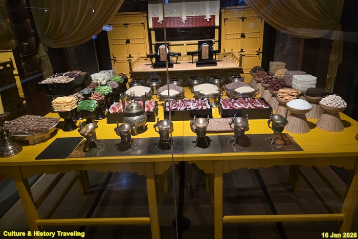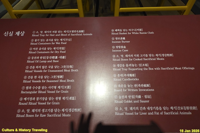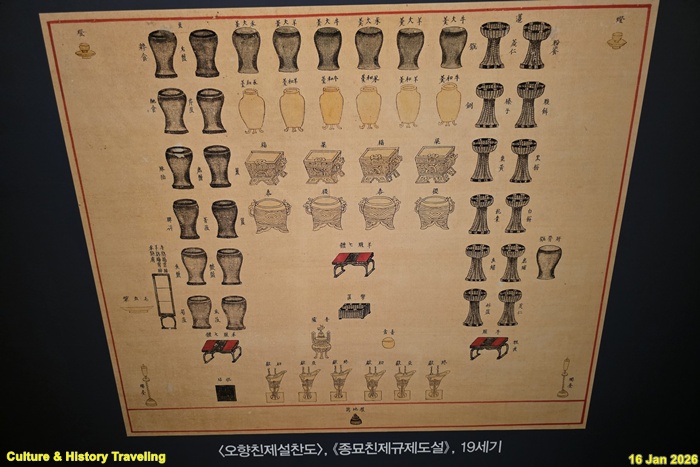 종묘 제향은 짐승의 고기와 피를 바치는 ‘혈식血食’의 제사로, 소·양·돼지가 중심 제물[희생犧牲]이었다. 희생으로 쓰이는 가축은 그 목적을 위해 특별히 정결하게 키운 것으로 제사상에는 희생의 털과 피, 생고기와 삶은 고기, 고기를 삶은 국물을 올렸다. 희생 외에도 기장과 수수 등의 곡식, 땅과 물에서 난 다양한 산물로 만든 각종 음식을 차렸다. (안내문, 고궁박물관, 2026년)