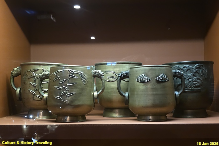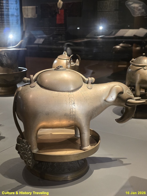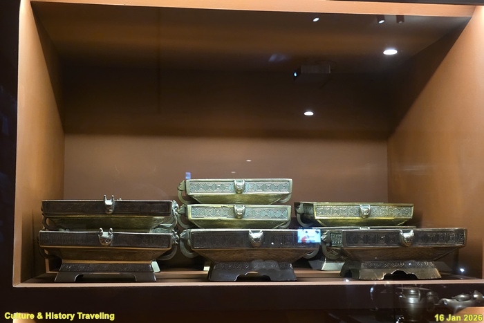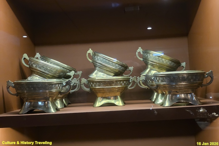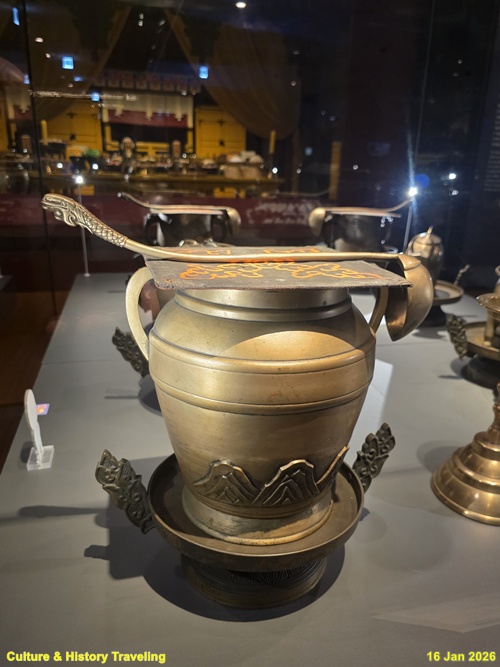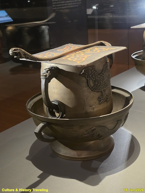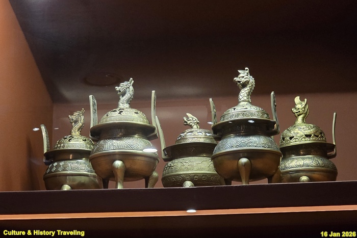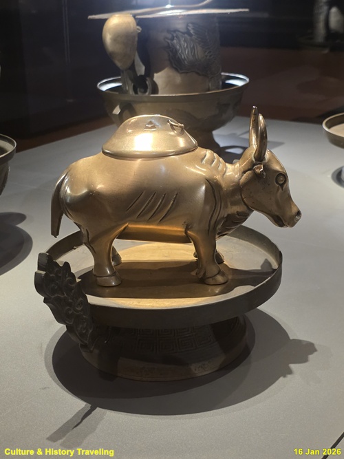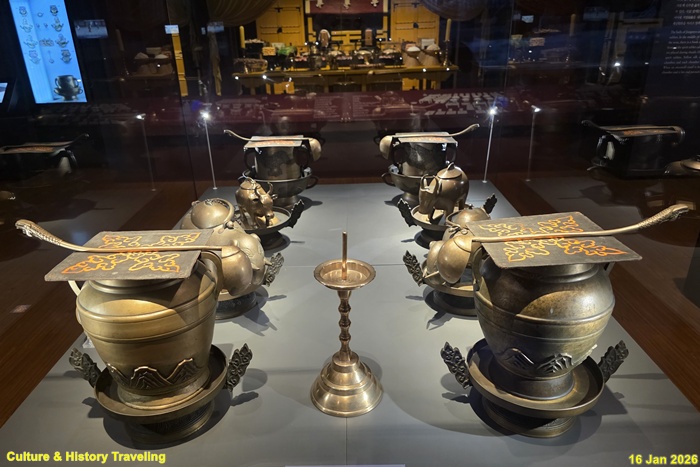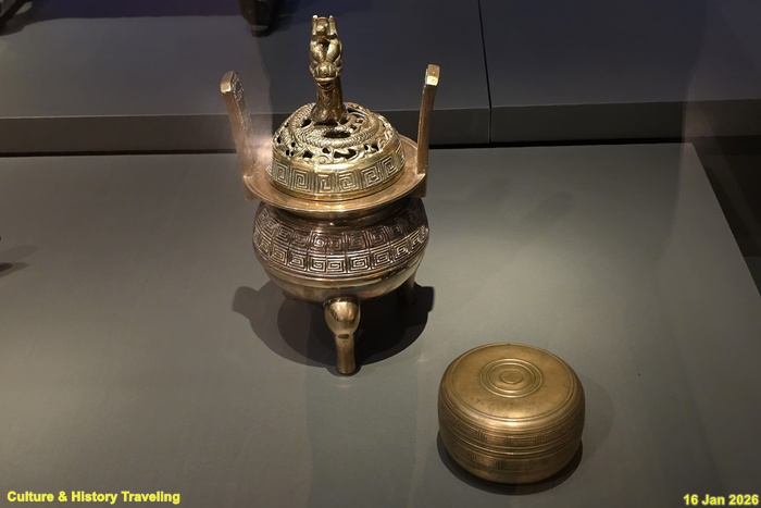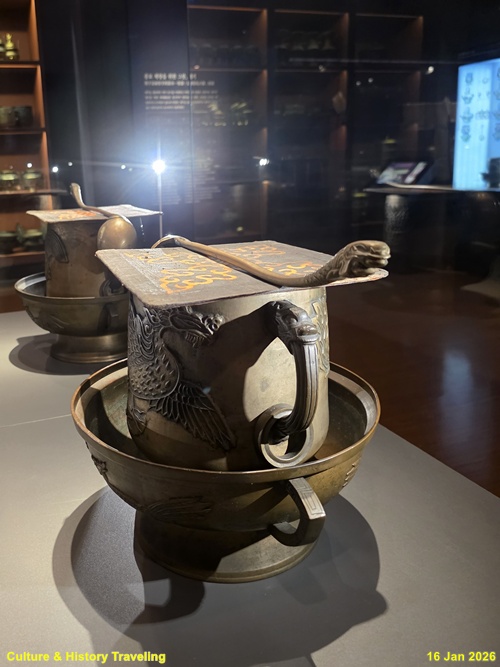 향을 태운 연기로 천상의 혼魂을 모시는 의식에 사용하는 제기인 향로와 향합이다. 신을 모셔와 인사를 하고 예물을 바치는 절차인 신관례 때 제사의 주관자인 초헌관이 향로에 향을 세 번 나누어 사른다. 왕이 친히 나서는 제사에서는 왕이 초헌관을 맡는다. (안내문, 고궁박물관, 2026년)