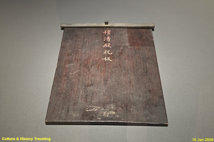 신에게 축원을 드리는 글인 축문을 올려두는 판과 누르는 문진이다. 축판은 주로 나무에 검은 칠을 하여 만들었다. 축문은 초헌관이 첫 술잔을 올린 후 읽었으며 바람에 날리지 않게 놋쇠로 된 문진으로 눌러 제사상의 서쪽에 놓았다. (안내문, 고궁박물관, 2026년)