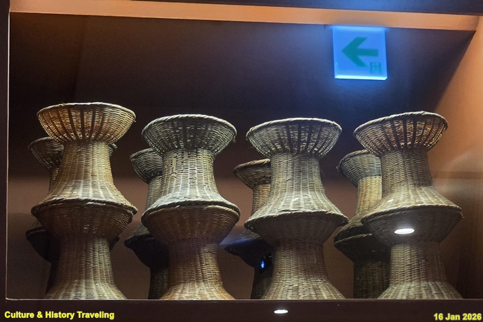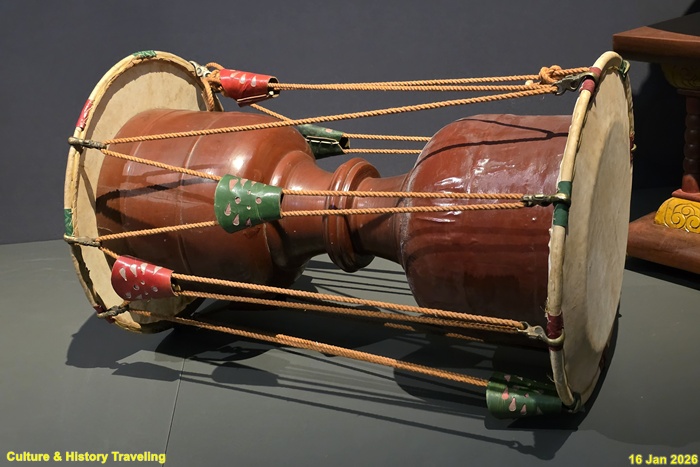 허리가 잘록한 나무 울림통 양쪽에 가죽을 대어 만든 타악기이다. 울림통의 왼쪽을 북편, 오른쪽을 채편이라고 하는데, 북편은 손으로 치고 채편은 대나무로 만든 얇은 채로 친다. 조선 왕실에서 행해진 각종 의례에 두루 사용되었다. (안내문, 고궁박물관, 2026년)