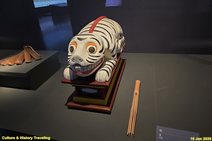 엎드린 호랑이 모습을 나무로 조각하여 만든 타악기로, 음악의 끝을 알리는 역할을 한다. 호랑이 등줄기에 있는 톱니 모양 갈기를 대나무 채로 긁어 연주한다. 음陰을 상징하는 어는 음악의 시작을 알리는 축祝과 대비하여 서쪽에 놓았다. (안내문, 고궁박물관, 2026년)