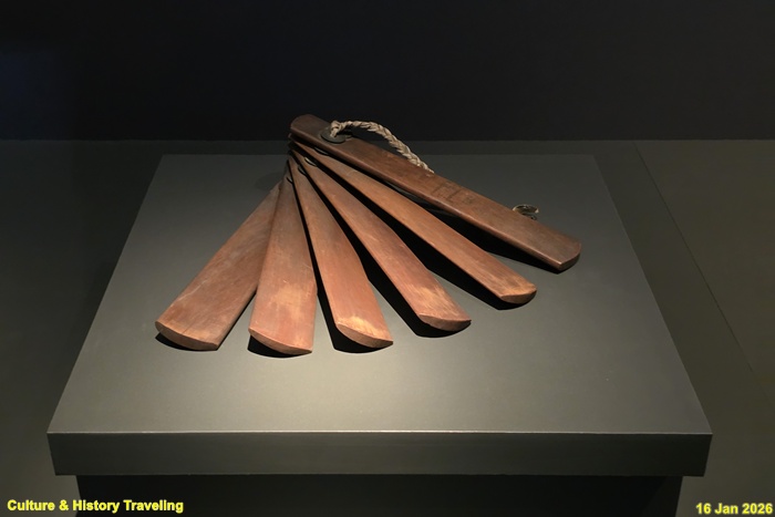 음악의 시작과 끝, 또는 악절이 바뀔 때 치는 타악기이다. 좁고 긴 나무판 6개를 엮어 판 사이에 엽전을 끼워 만들었다. 박의 아랫부분을 부채처럼 폈다가 빠르고 힘있게 위쪽으로 접어 올려쳐 연주한다. (안내문, 고궁박물관, 2026년)