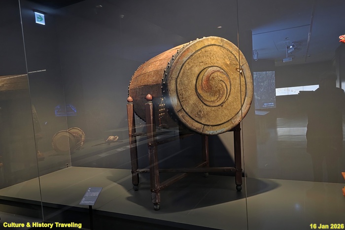 진고는 현재 전하는 북 가운데 북통이 가장 큰 국악기이다. 네 개의 기둥으로 받친 나무틀 위에 올려놓은 북을 두 손으로 나무채를 잡고 쳐서 소리 낸다. 북면에 닿는 나무채의 끝 부분은 형겊으로 감아 사용한다. 조선시대에는 국가제례 때 사용하였다. (안내문, 고궁박물관, 2026년)