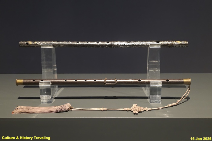 가로로 부는 관악기인 대금이다. 일반적으로는 대나무로 만들어지나 철로 제작되어 연주용이 아닌 의례용으로 보인다. 두 대금 모두 겉면에 실제 악기와 같이 대나무 마디를 표현하였다. 금은입사대금은 넝쿨 문양과 학鶴 문양을 금사와 은사를 넣어 장식했다. (안내문, 고궁박물관, 2026년)