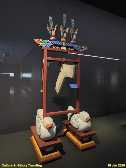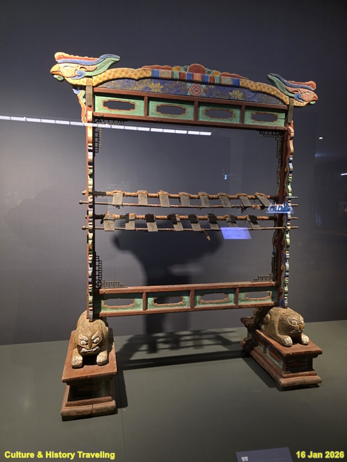 돌로 만든’ㄱ’자 모양의 경 한 개를 나무를에 매달아 안든 타악기이다, 망치 모양의 채로 경의 아랫부분을 쳐서 소리 낸다. 동양 음악에서 사용하는 한 속타브 범위 내의 십이율 중 첫 음인 황종을 낸다. (안내문, 고궁박물관, 2026년)
