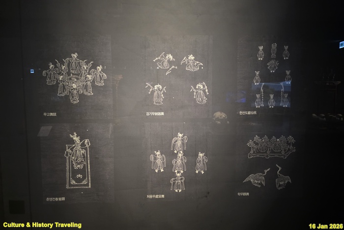 정재(呈才)는 ‘재주를 바친다’는 의미로, 의례 때 공연되었던 음악과 노래, 춤이 어우러진 종합공연예술이다. 조선 왕실은 잔치에 음악과 노래, 무용을 함께 올려 신하, 백성과 더불어 즐기고자 했다. 정재는 대체로 기존의 전해오는 선율에 새로운 노랫말과 춤을 얹는 방법으로 창작되었으며, 국왕의 장수, 왕조의 번영을 바라는 내용이 많다. 〈헌선도獻仙桃〉는 한 개만 먹어도 천년을 살 수 있다는 복숭아를 국왕께 올리는 내용이며, <봉래의鳳來儀>는 조선 왕조의 개국을 찬양하는 ‘용비어천가龍飛御天歌’의 가사에 맞춰 춤을 추고 노래한 것이다. 민간에서 유행하던 연희를 궁중잔치에 올리기도 하였는데 <선유락船遊樂>이나 <검기무劍器舞> 등이 대표적이다. (안내문, 고궁박물관, 2026년)