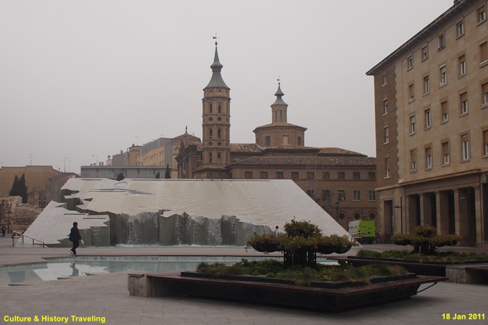 필라르 광장의 한쪽 끝을 장식하고 있는 ‘푸엔테 데 라 히스파니다드(Fuente de la Hispanidad)’이다. 1991년에 완공된 이 분수는 ‘라틴 아메리카의 날(10월 12일)’과 성모 필라르 축제를 기념하여 만들어졌다.