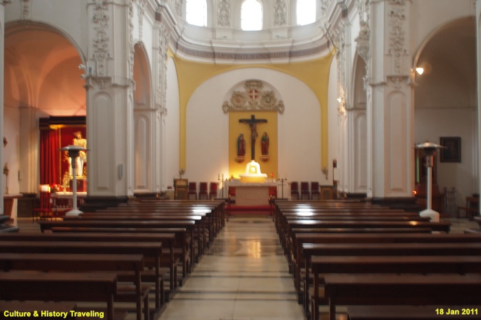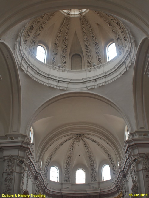 교회의 내부는 절제된 바로크 양식과 경건하고 아늑한 분위기가 특징이다. 내부 공간이 나뉘지 않고 하나의 큰 홀처럼 되어 있습니다. 이 덕분에 입구에 들어서자마자 정면의 제단까지 시선이 탁 트여 있어 실제 크기보다 개방감이 느껴진다.