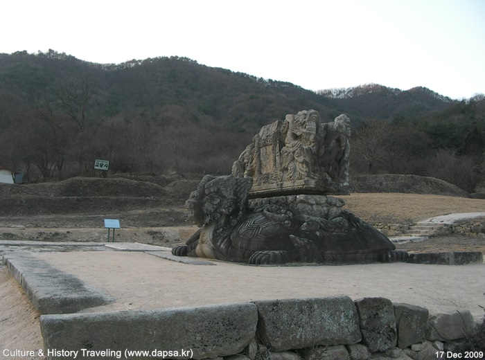 고달사지 절터에 남아 있는 거북받침돌과 머릿돌이다. 비몸이 없지만 높이가 2 m인 상당히 큰 규모의 탑비이다.