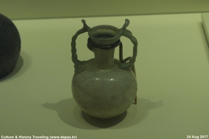 7세기 말부터 10세기까지로 거슬러 올라가는 이 유리병들은 순례길을 끼고 있는 라바다 지역의 대표적인 출토품입니다. 수수해 보이는 이 일상용품들은 초기 이슬람 세계 전역에서 사용되었습니다. 순례자들은 휴대가 간편한 개인 용품으로 사용하기도 했고, 여행중 자금이 피리요할 때 병이나 병 안에 담긴 것을 팔기도 했습니다. 라바다 지역에 유리 가마 유적이 있어 직접 제품을 생산했다는 것을 알 수 있습니다. (안내문, 중앙박물관 특별전, 2017년)
